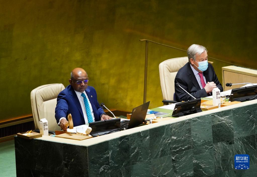 9月21日,在位于紐約的聯合國總部,第76屆聯合國大會主席阿卜杜拉·沙希德(左)主持聯合國大會一般性辯論開幕式。