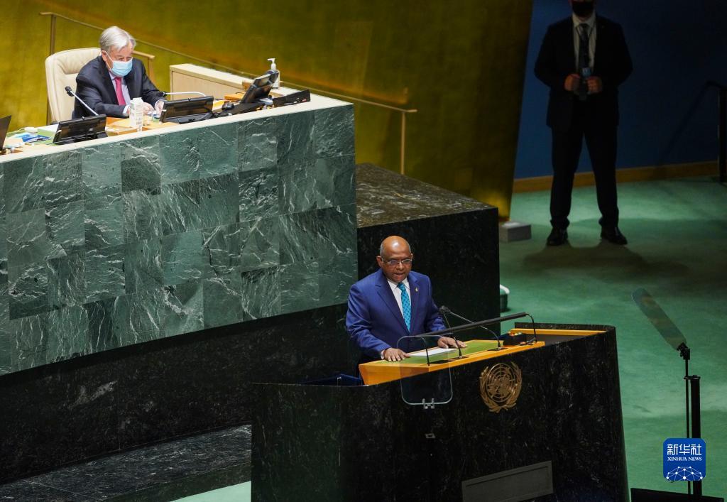 9月21日,在位于紐約的聯合國總部,第76屆聯合國大會主席阿卜杜拉·沙希德(前)主持聯合國大會一般性辯論開幕式。