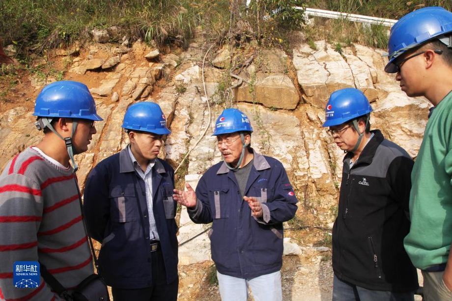 南仁東(中)與工程技術人員在大窩凼施工現場檢查施工進展(2014年12月1日攝)。新華社發(中科院國家天文臺供圖)