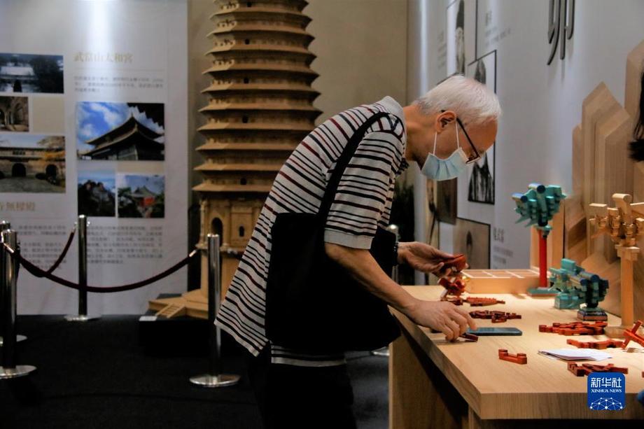 在香港會議展覽中心,市民在大國建造主題展上體驗榫卯結構模型(10月26日攝)。新華社記者 張佳怡 攝