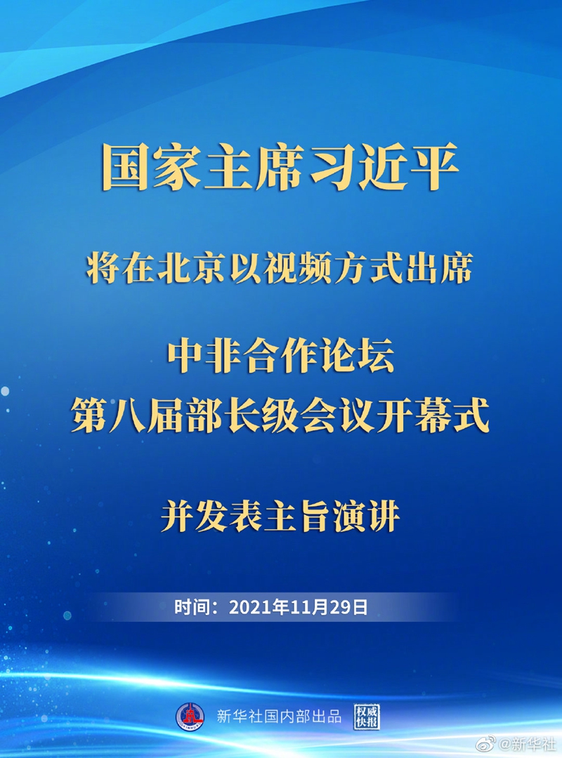 外交部發言人華春瑩11月26日宣布:國家主席習近平將于11月29日在北京以視頻方式出席中非合作論壇第八屆部長級會議開幕式并發表主旨演講。