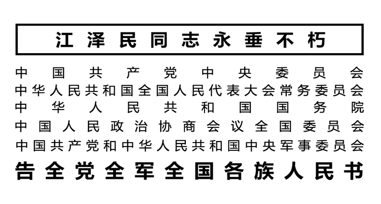 北京西郊機場國旗半垂,氣氛莊嚴肅穆,黑底白字橫幅上寫著:“江澤民同志永垂不朽”“江澤民同志永遠活在我們心中”。習近平和夫人彭麗媛等胸佩白花、臂戴黑紗,神情凝重地在停機坪肅立。
