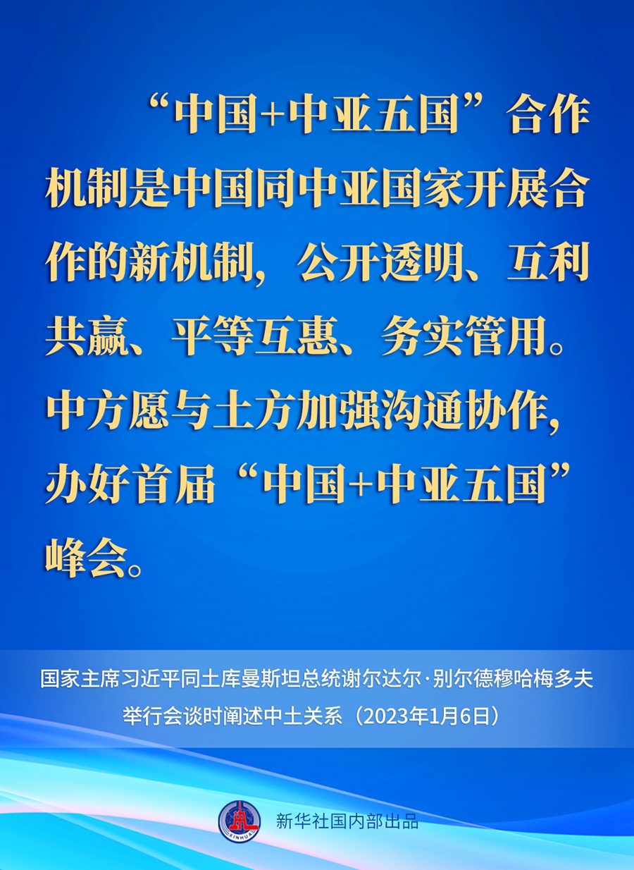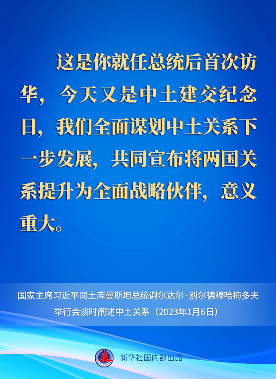 1月6日上午,國家主席習近平在人民大會堂同來華進行國事訪問的土庫曼斯坦總統謝爾達爾·別爾德穆哈梅多夫舉行會談。兩國元首宣布,將中土關系提升為全面戰略伙伴關系。會談中,習近平主席就中土關系作出一系列重要論述,一起來看要點。