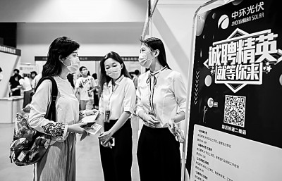 2022年7月30日,在呼和浩特市高校畢業生系列招聘活動現場,工作人員向求職者介紹工作崗位。丁根厚攝/光明圖片