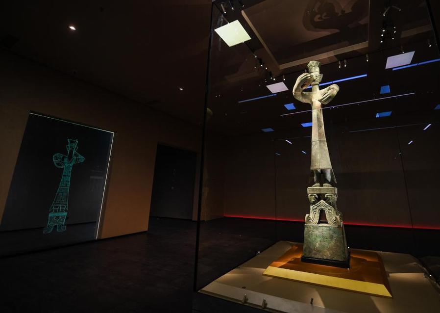 這是日前在四川省三星堆博物館新館拍攝的青銅大立人像。新華社記者王曦 攝