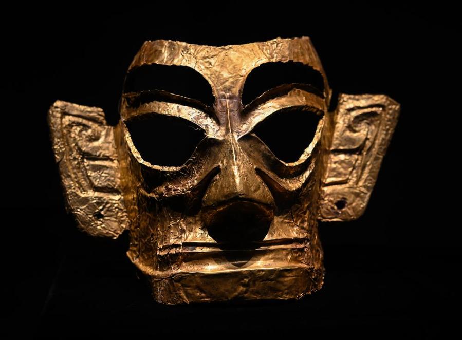 這是日前在三星堆博物館新館拍攝的新展出的金面具。新華社記者王曦 攝