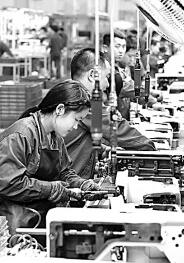 浙江臺(tái)州一家科技公司裝配車間里,工作人員在裝配縫紉機(jī)。新華社發(fā)