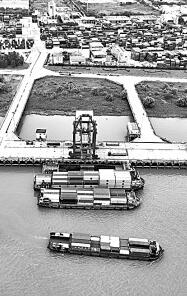 安徽港口蕪湖港朱家橋港區(qū)國際集裝箱碼頭,貨輪正在進(jìn)行集裝箱裝卸作業(yè)。王玉實(shí)攝/光明圖片