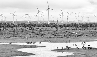 江蘇鹽城大豐區(qū)“風(fēng)補(bǔ)漁”產(chǎn)業(yè)示范基地,風(fēng)力機(jī)組林立。計(jì)海新攝/光明圖片