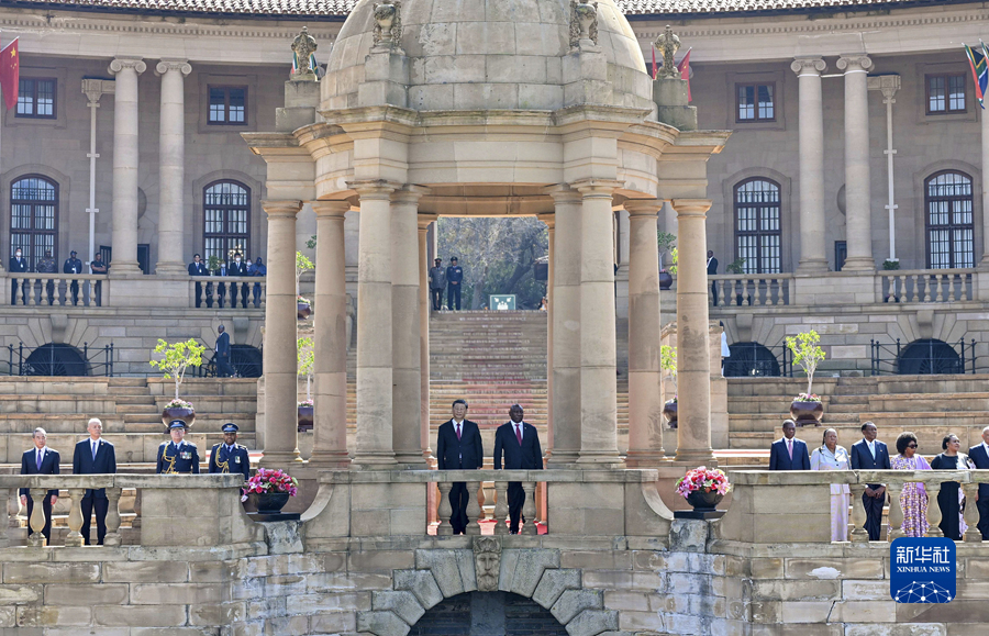 8月的比勒陀利亞,晴空萬(wàn)里,惠風(fēng)和暢??偨y(tǒng)府廣場(chǎng)鮮花盛開(kāi),中南兩國(guó)國(guó)旗迎風(fēng)飄揚(yáng)。在總統(tǒng)摩托車(chē)隊(duì)護(hù)衛(wèi)下,習(xí)近平乘車(chē)抵達(dá)總統(tǒng)府,拉馬福薩在下車(chē)處熱情迎接。兩國(guó)元首登上檢閱臺(tái)。儀仗隊(duì)行持槍禮,軍樂(lè)隊(duì)奏中南兩國(guó)國(guó)歌,現(xiàn)場(chǎng)鳴放21響禮炮。習(xí)近平檢閱南非儀仗隊(duì)。兩國(guó)元首同雙方陪同人員一一握手。