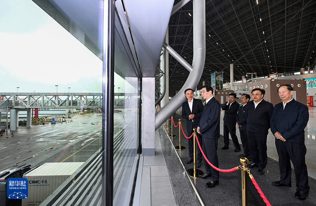 11月20日至22日,中共中央政治局常委、全國政協主席王滬寧在海南調研。這是11月20日,王滬寧在海南自由貿易港新海港綜合客運樞紐了解封關運作口岸建設及管理運行情況。新華社記者饒愛民 攝