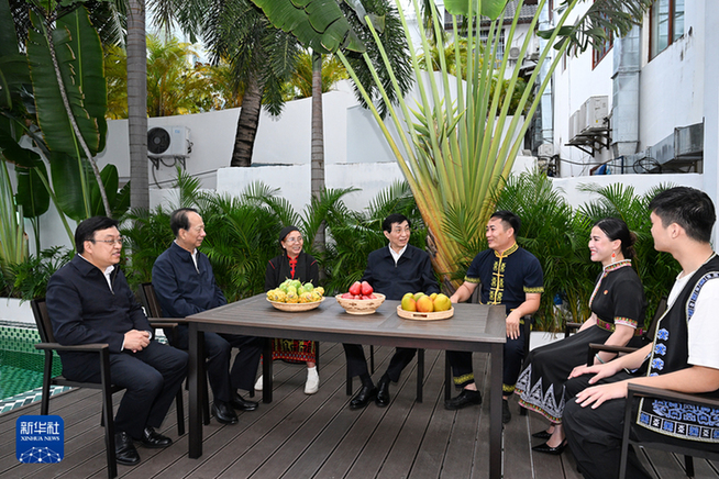 11月20日至22日,中共中央政治局常委、全國政協主席王滬寧在海南調研。這是11月21日,王滬寧在三亞市吉陽區博后村看望黎族群眾。新華社記者饒愛民 攝