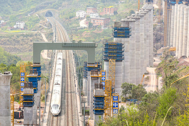 2025年3月27日,在成達萬高鐵左線福壽跨渝萬城際特大橋項目施工現場,成達萬高鐵首個跨既有高鐵鋼橫梁吊裝完成,鄭渝高鐵線上一列動車從門式墩鋼橫梁下通過。新華社發(黃茂程攝)