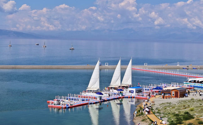這是2025年7月17日在新疆博爾塔拉蒙古自治州賽里木湖景區拍攝的電動帆船游玩項目(無人機照片)。新華社發(張利民攝)