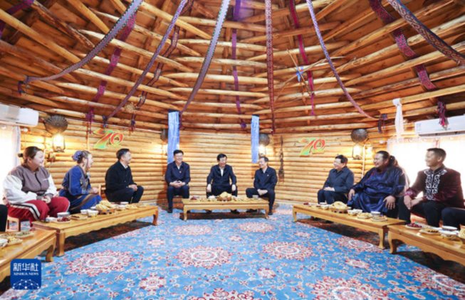 9月27日,受習近平總書記囑托,中共中央政治局常委、全國政協主席、中央代表團團長王滬寧帶領中央代表團部分成員到阿勒泰地區布爾津縣考察。這是王滬寧和中央代表團部分成員在扎拉特鄉村旅游專業合作社同村民交流。新華社記者姚大偉 攝