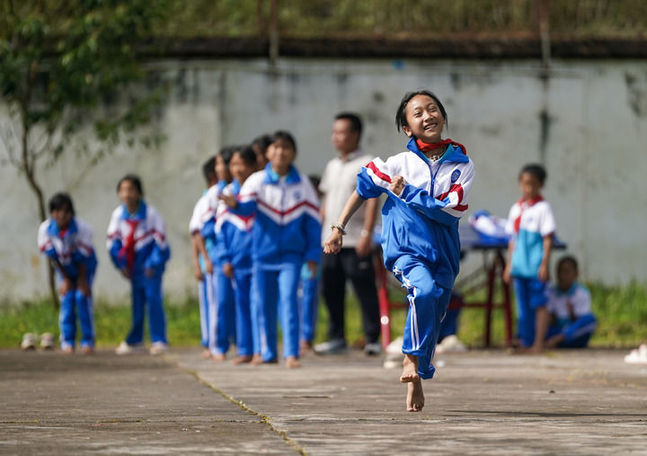 2025年9月15日,云南省普洱市孟連傣族拉祜族佤族自治縣臘福小學學生課間在操場進行奔跑接力比賽。新華社記者 陳欣波攝